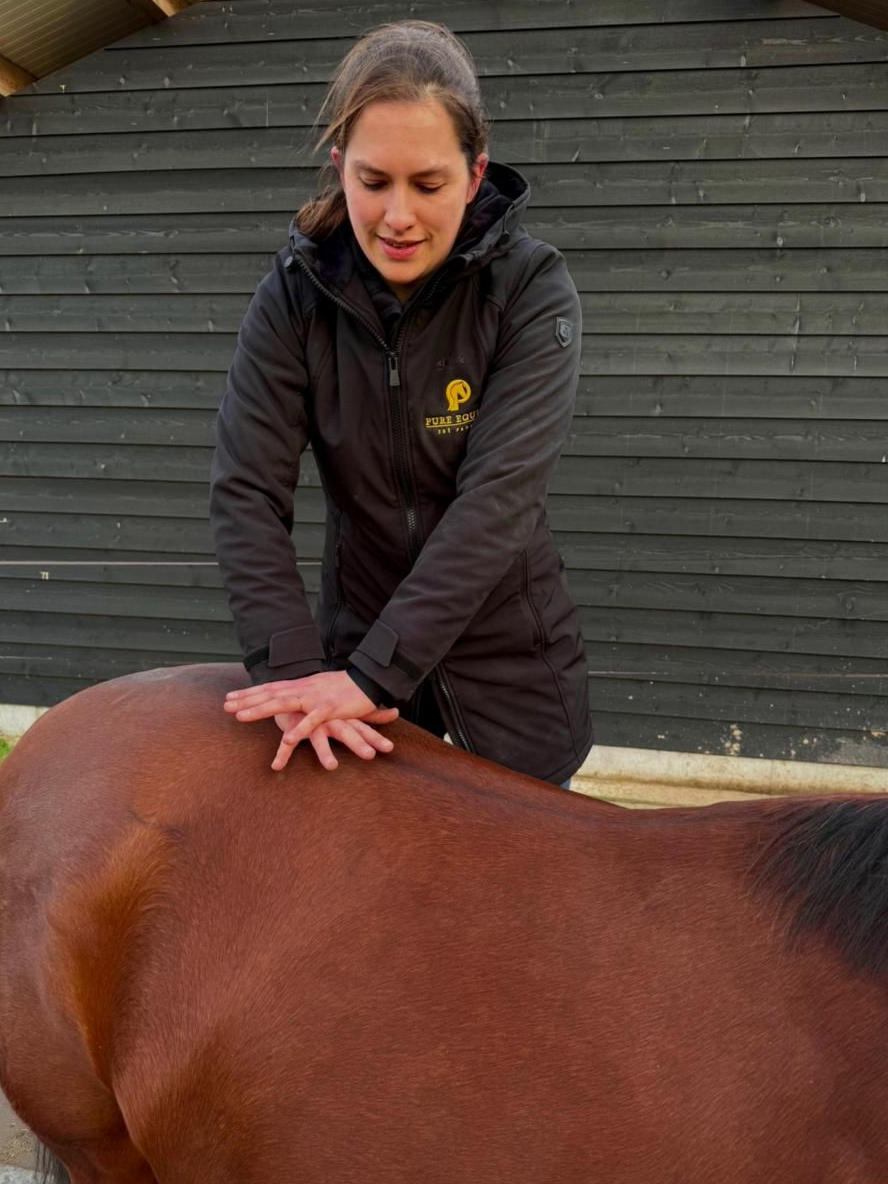 Hierna wordt het paard volledig afgevoeld op mobiliteit, pijnlijkheden, spierspanning, etc. De spieren en fascie van de rug worden geholpen om te ontspannen, de wervelkolom van hals/rug/bekken wordt vrijgemaakt van blokkades en de beweeglijkheid van de schouderbladen wordt gecontroleerd en indien nodig verbeterd.
